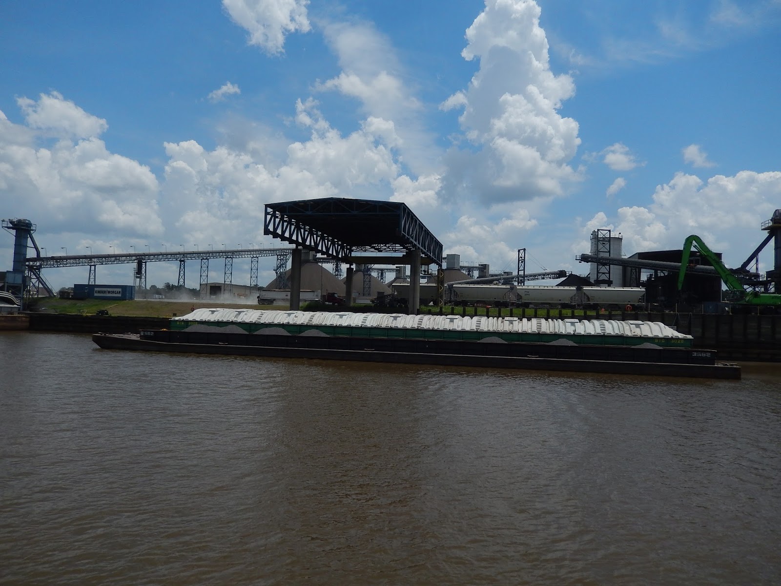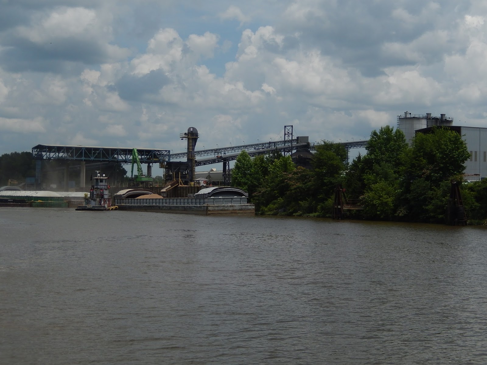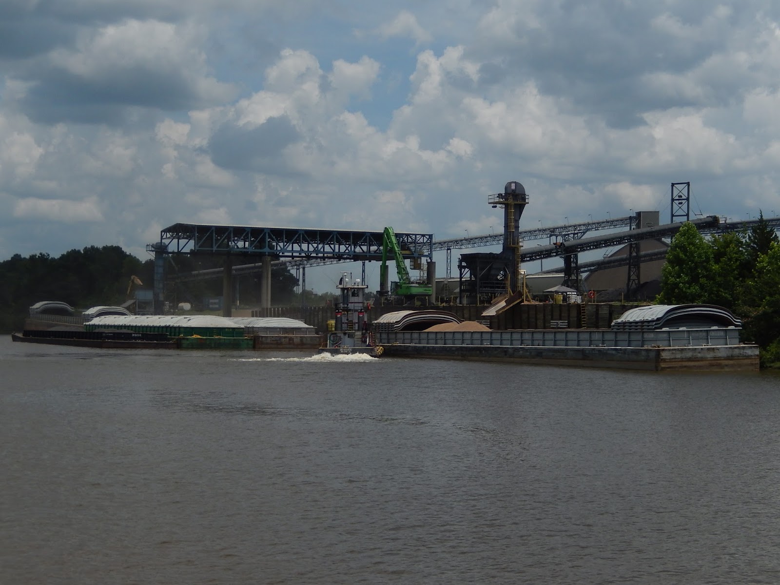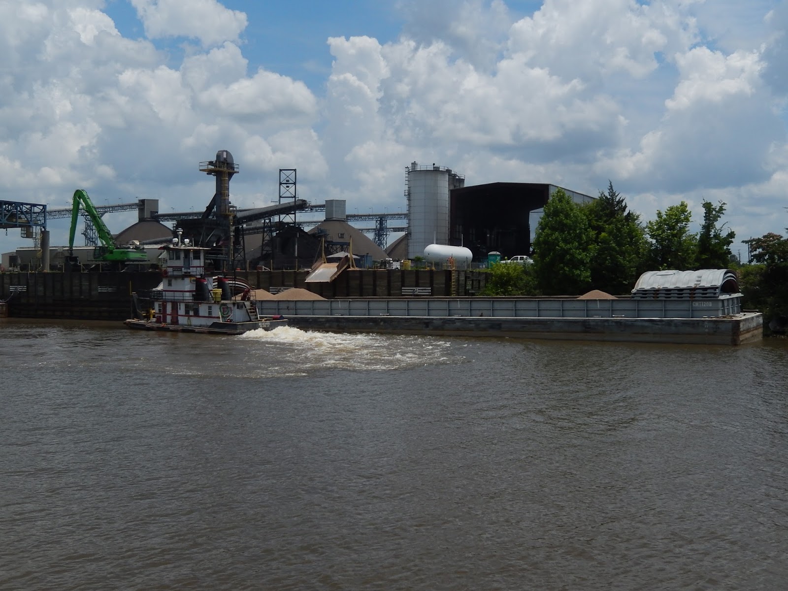 The small tow is moving the barge forward to ready it for the next truck to dump it's load into the barge.
