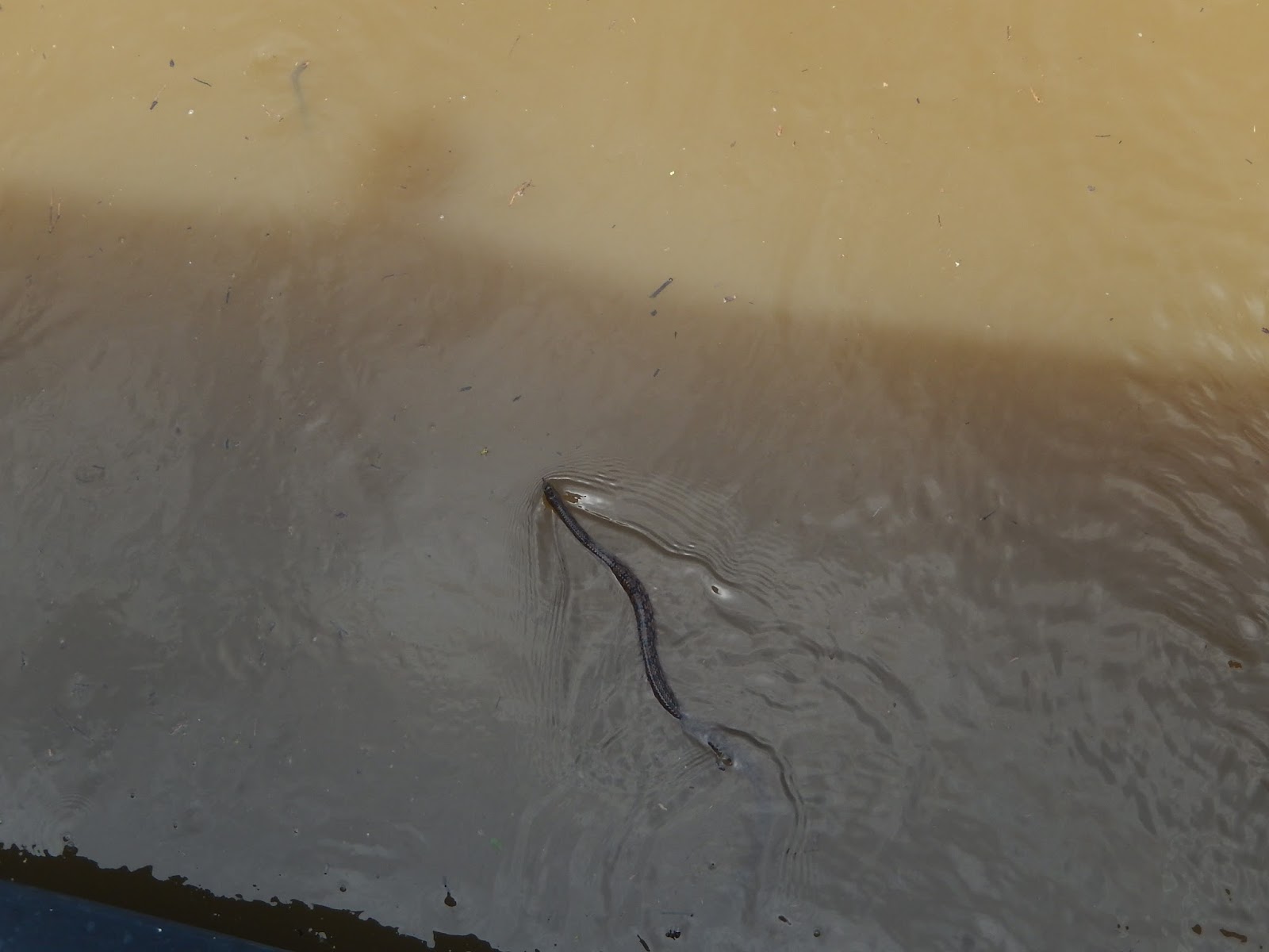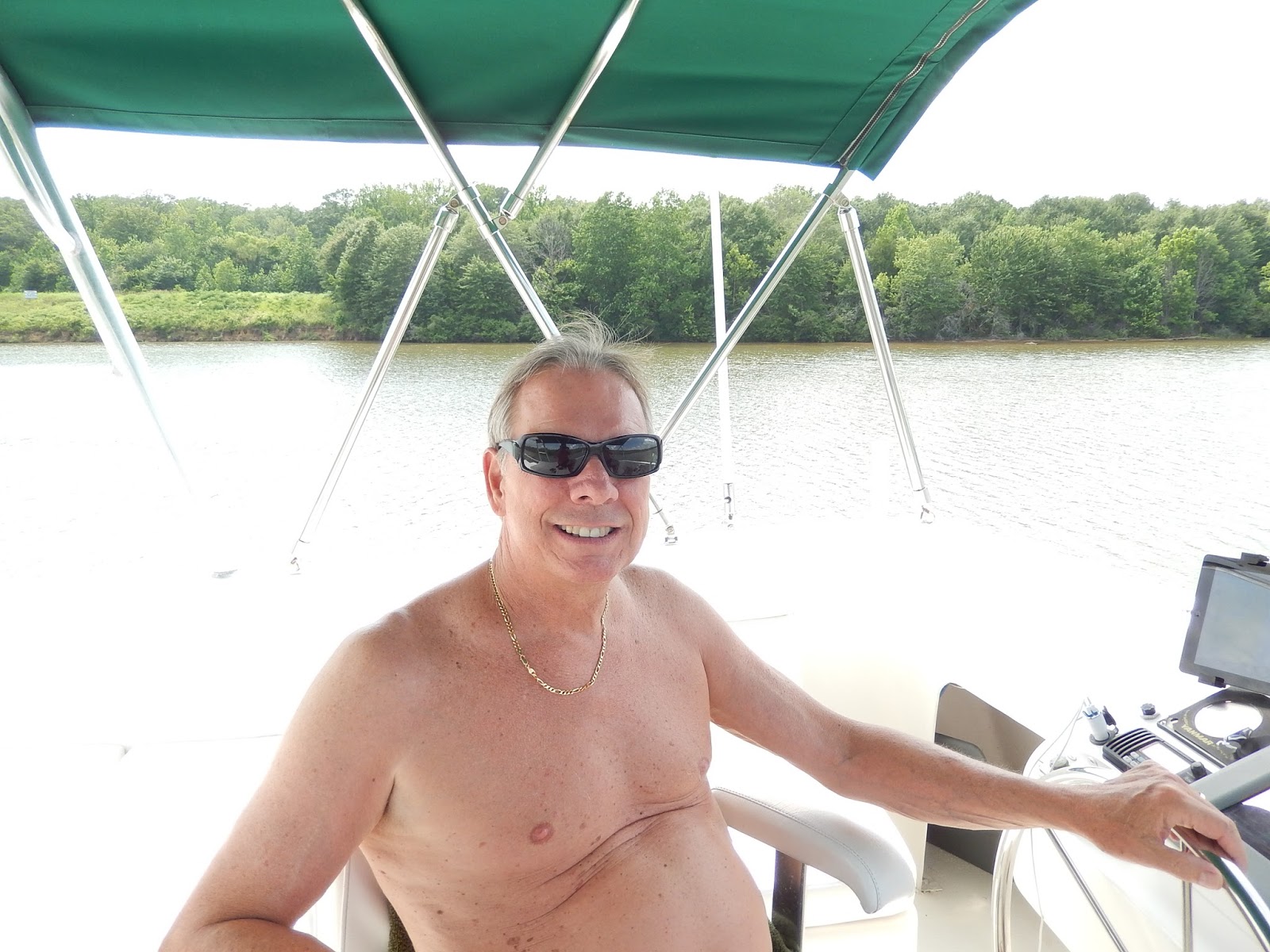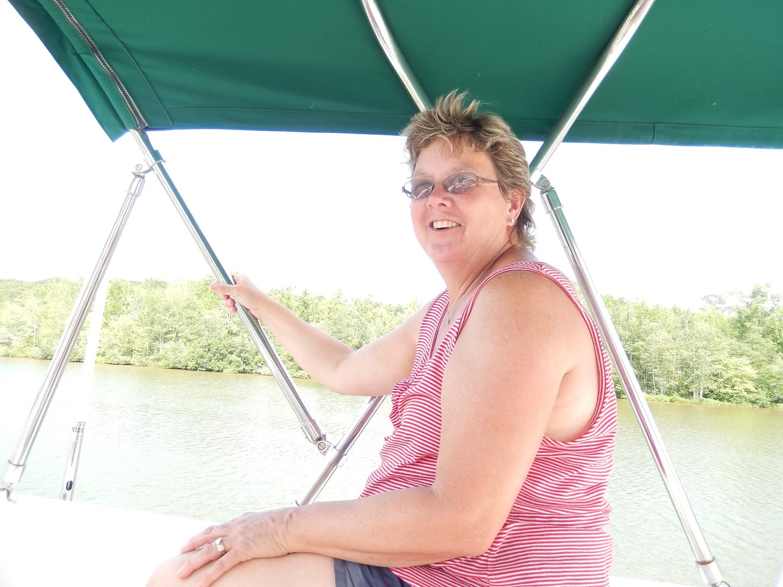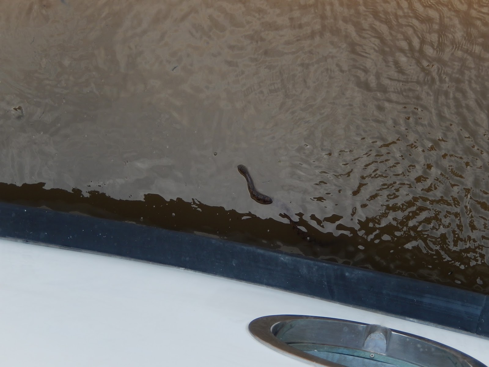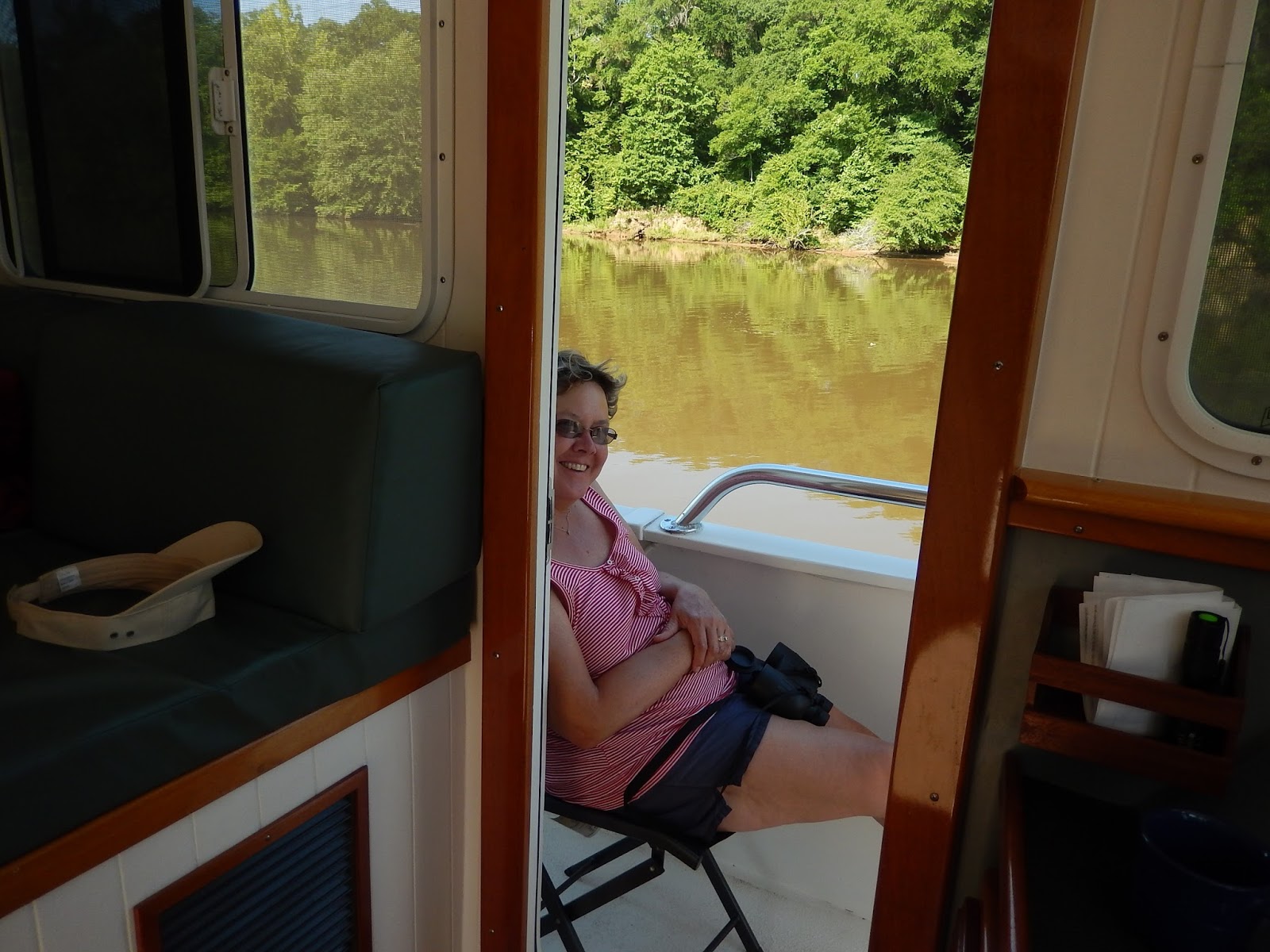 Here it's getting hot and humid so Viv decides to catch air on the shade side of the boat.
